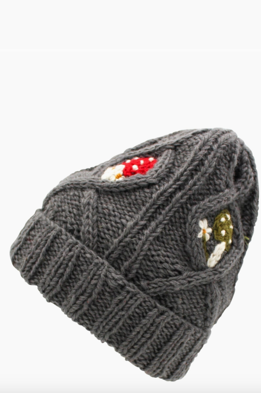 Cozy meets character in this unisex grey cable knit beanie, where delicate embroidered mushrooms bring whimsical boho charm to a timeless retro silhouette. The fitted design hugs your head comfortably while the textured knit adds warmth and visual interest. Perfect for nature lovers and vintage enthusiasts who want their winter accessories to tell a story. Layer it with your favorite outfits for an effortlessly cool, nostalgic vibe that stands out from the crowd.
