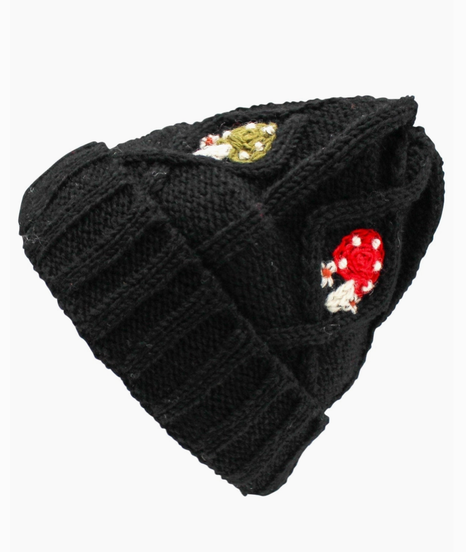 Cozy meets character in this unisex black cable knit beanie, where delicate embroidered mushrooms bring whimsical boho charm to a timeless retro silhouette. The fitted design hugs your head comfortably while the textured knit adds warmth and visual interest. Perfect for nature lovers and vintage enthusiasts who want their winter accessories to tell a story. Layer it with your favorite outfits for an effortlessly cool, nostalgic vibe that stands out from the crowd.