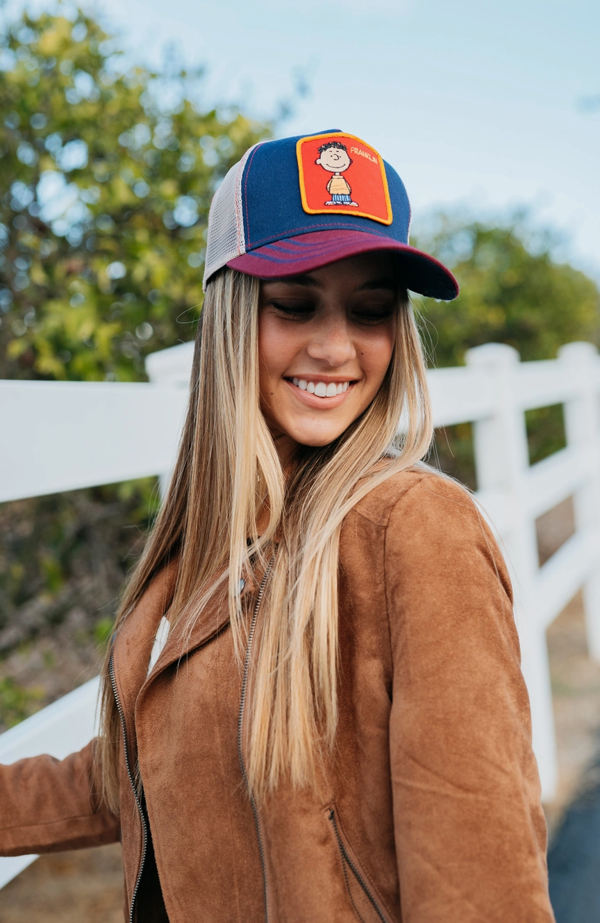 Show off your love for the classic Peanuts cartoon with this retro Franklin Trucker Hat. Featuring a navy crown with a vibrant orange patch of Franklin, paired with a rich burgundy brim, this unisex hat brings a pop of color and character to any outfit. Perfect for casual wear, it combines timeless style with playful charm, making it a standout accessory for fans and fashion lovers alike.