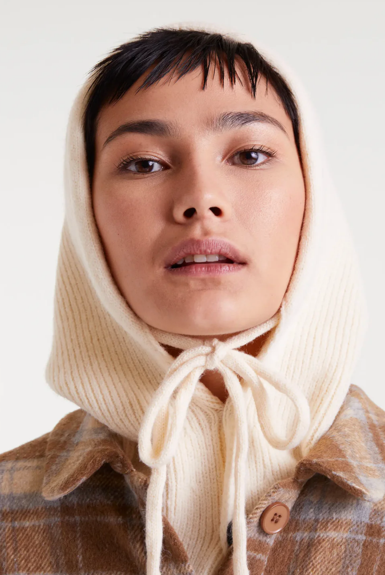 Stay cozy and stylish with our Rib-Knit Balaclava in a soft off white. Crafted from gentle rib-knit fabric with a adjustable drawstring ensures a secure, personalized feel, making it perfect for chilly days or urban adventures. Elevate your cold-weather wardrobe with this fashionable accessory that combines warmth and modern flair effortlessly.