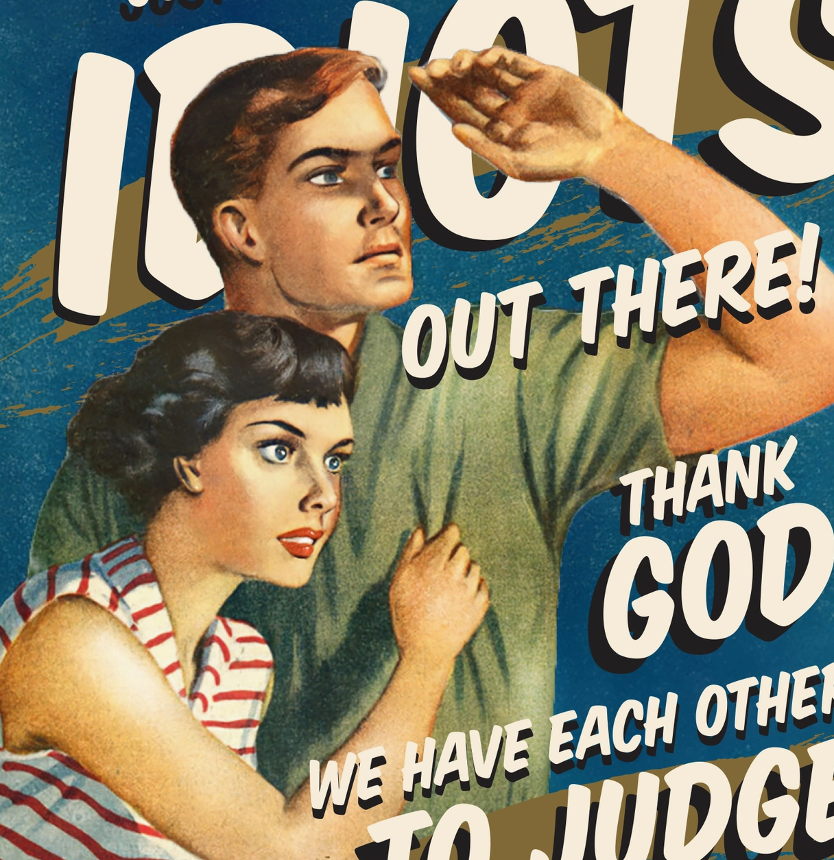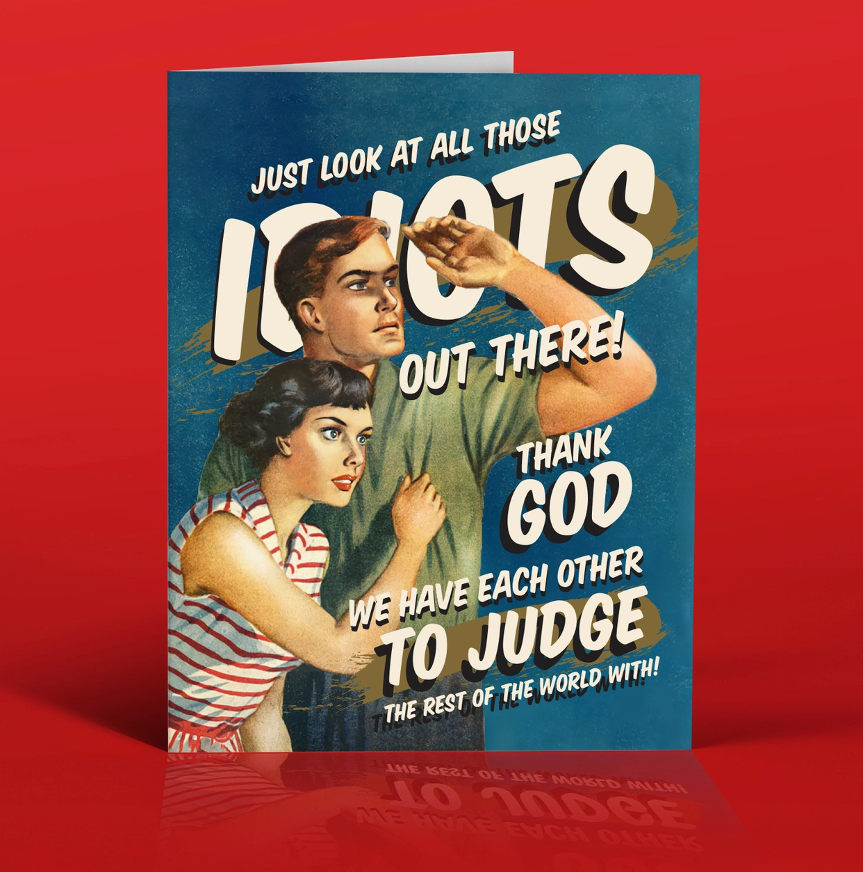 # Those Idiots! Greeting Card Skip the saccharine sentiments and go straight for the truth. This greeting card pairs retro-inspired visuals with a sharp sense of humor that actually captures what friendship looks like—messy, hilarious, and completely authentic. Perfect for the people in your life who get the joke, who've earned your eye-rolls, and who you'd defend fiercely anyway. Blank interior to write your own personalized message.