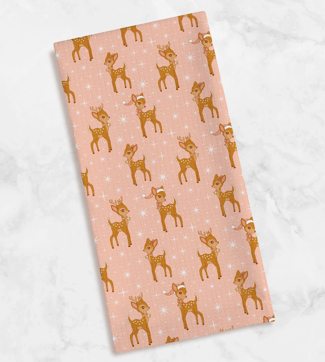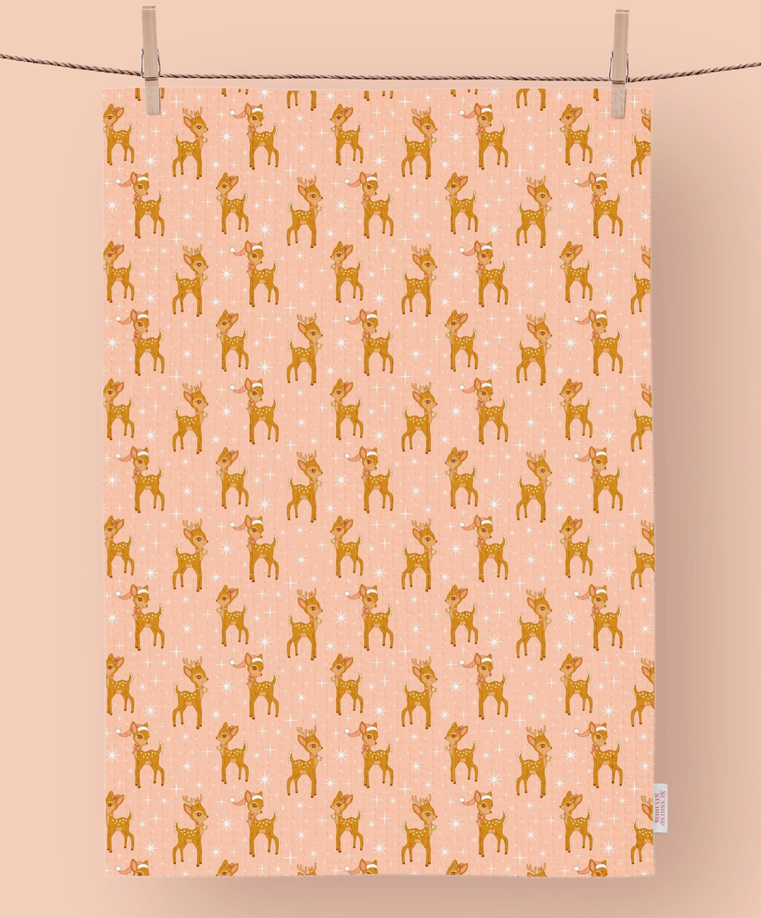 Bring festive charm to your kitchen with this delightful eco-friendly holiday tea towel featuring an adorable reindeer print on soft light pink. The textured waffle weave design adds both visual interest and practical absorbency, making it perfect for drying dishes or displaying as seasonal décor. Its retro aesthetic captures nostalgic holiday spirit while the gentle color palette complements any kitchen style. An ideal gift for holiday enthusiasts or a cozy addition to your own home.