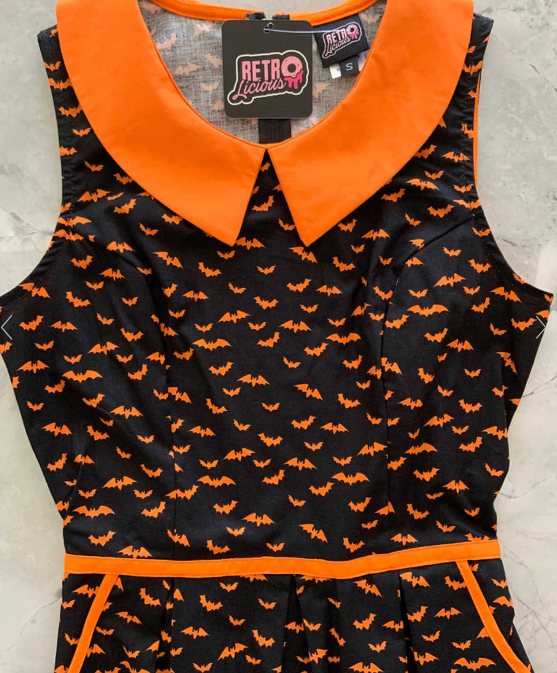 Fun and totally functional, this retro dress is bound to be your new favorite! Shown in our spooky cute bats print, this 1950s style cotton dress features a contrast Peter Pan collar, contrast piping throughout, a-line skirt with side pockets, and a back zippered closure.