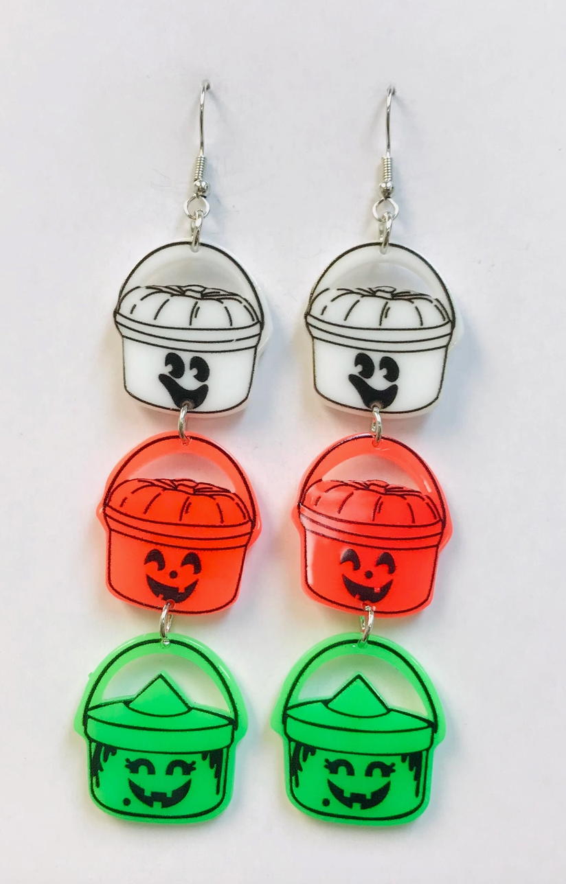 Capture the spirit of Halloween with these Retro Trick or Treat Bucket Dangle Earrings. Featuring nostalgic white, orange, and green bucket charms, they bring a playful, vintage charm to your festive look. Lightweight and eye-catching, these earrings add a fun throwback touch to your costume or everyday style, making every moment feel like a cherished Halloween memory.