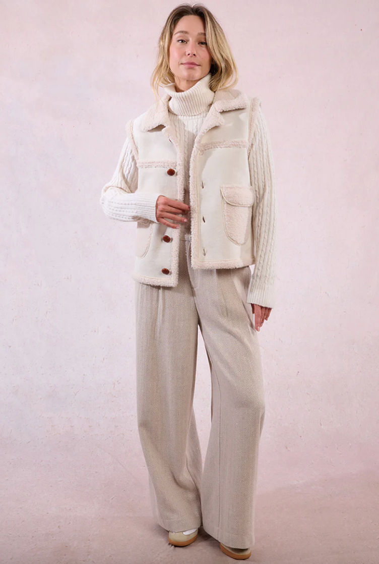 Embrace cozy elegance with this retro-inspired faux fur trimmed suede vest, a Colorado-inspired essential that captures the spirit of mountain style. The luxurious suede body pairs beautifully with plush faux fur trim for a sophisticated layering piece that works year-round. Contrast button closure adds visual interest and easy wearability, while the crisp winter white hue brings fresh, timeless appeal to any outfit. Perfect for those who crave that laid-back alpine aesthetic without compromising on warmth or refinement.
