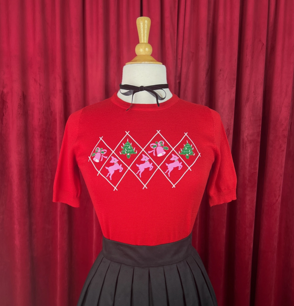 This festive red retro Merry Reindeer Short Sleeve Knit Top is the ultimate holiday sweater for any 50s-inspired outfit. In a classic red color, this top adds a touch of holiday cheer to any look. Step into the season in style with this fun and cozy knit sweater top.