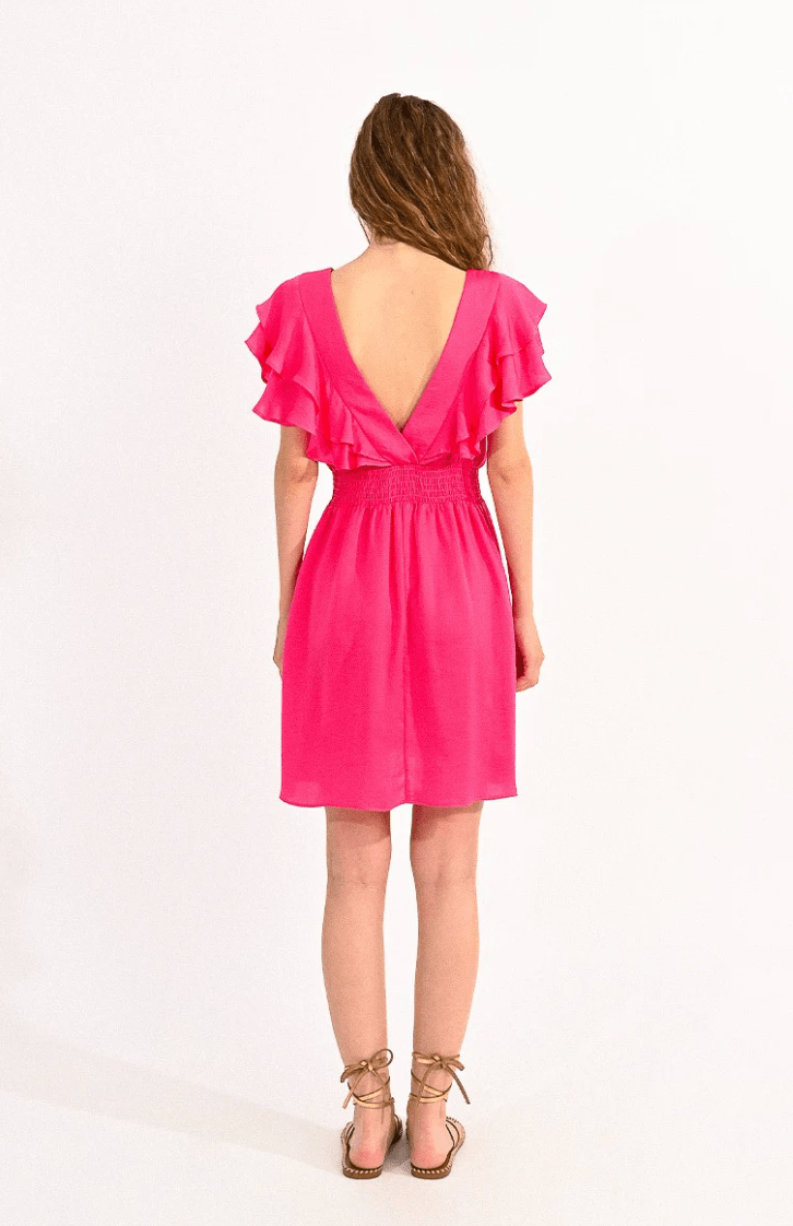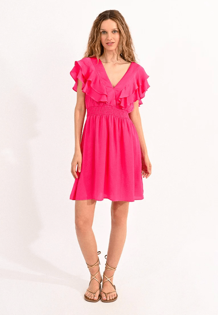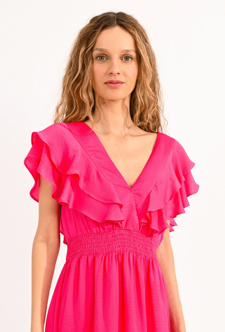Sashay into your next event with confidence in our hot pink Flutter Ruffle Mini Dress. This flirty and feminine dress is perfect for any cocktail occasion, exuding elegance and style. With its delicate ruffles and flattering silhouette, you'll be the center of attention all night long. Elevate your look and feel effortlessly beautiful.