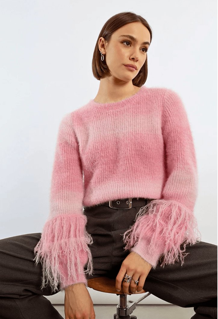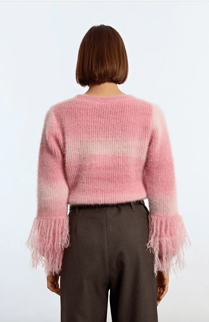 Expertly crafted from a soft knit material, this Fringe Sleeve Knit Sweater features a unique tie dye stripe design in feminine pink. Adding a touch of bohemian flair, the fringe detailing on the sleeves adds a touch of texture and movement to any outfit. Elevate your winter wardrobe with this must-have piece.