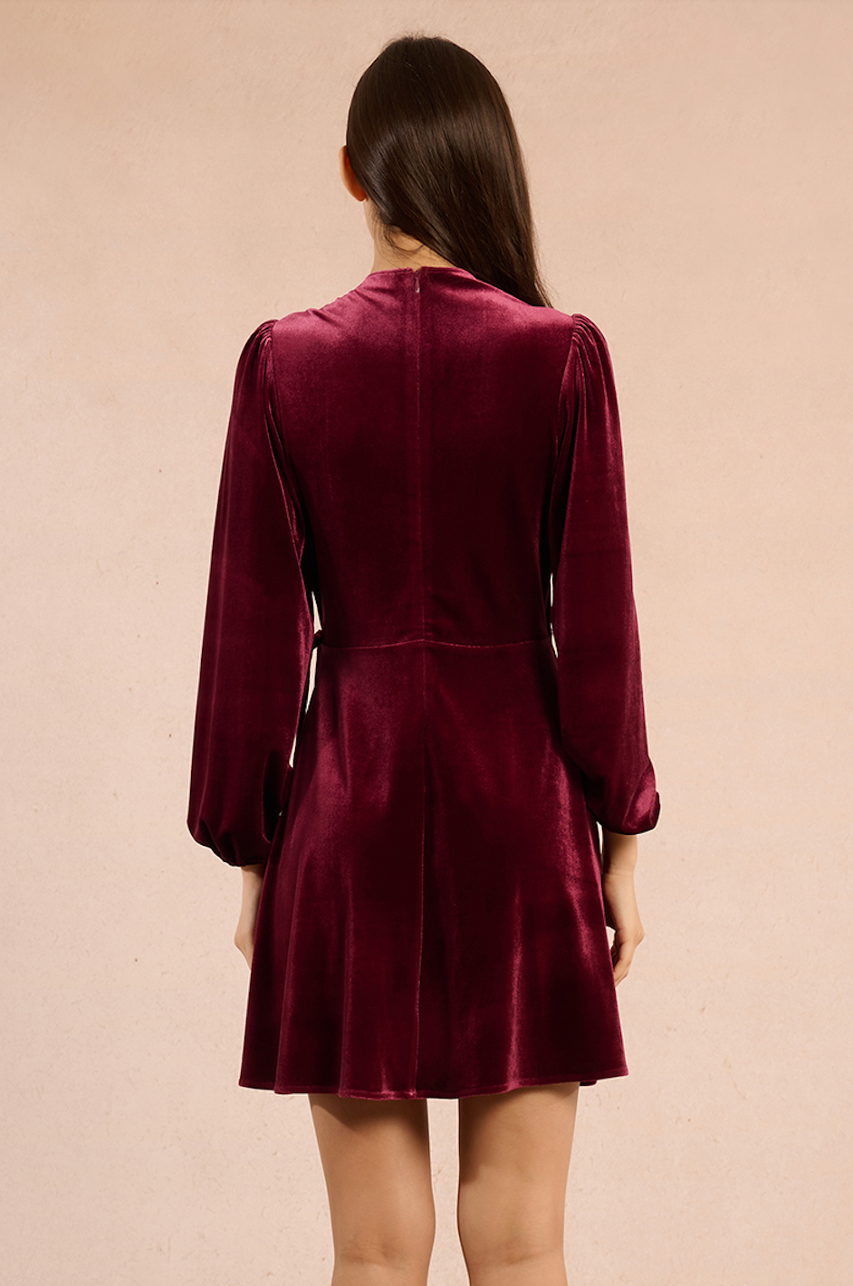 Elevate your style with this flirty burgundy faux wrap mini dress. Crafted to highlight your silhouette, its velvet fabric adds a touch of luxe while the faux wrap design offers a flattering fit. Perfect for nights out or special occasions, this dress combines comfort and elegance effortlessly. Turn heads with a look that's both playful and sophisticated.