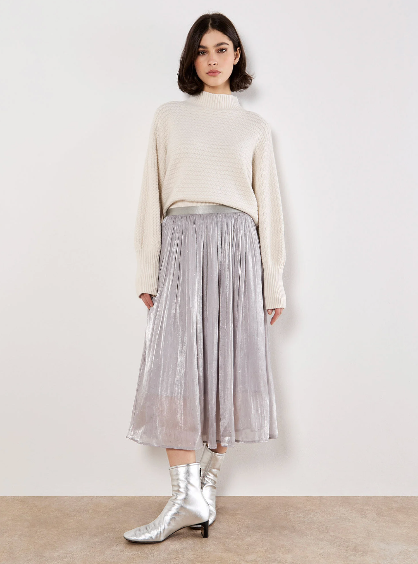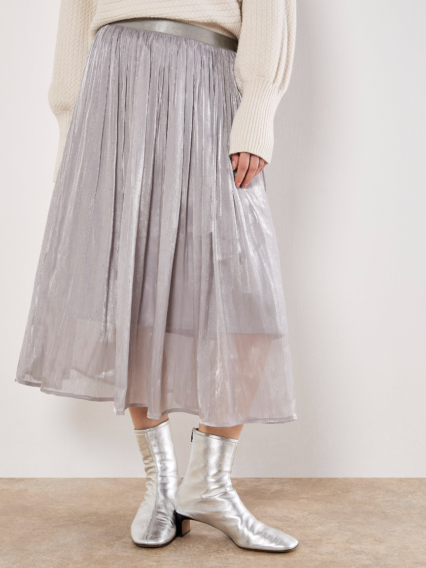 Elevate your evening look with this stunning Shimmer Stud Midi Skirt. Crafted from lustrous silver metallic mesh, it catches the light with every movement for an undeniably glamorous effect. The interior lining features eye-catching stud detailing that adds an edgy, sophisticated touch visible when you move. Perfect for special occasions or nights out, this skirt effortlessly transitions from classic elegance to bold statement piece. Pair it with a simple top to let the metallic sheen and studded accents take center stage.