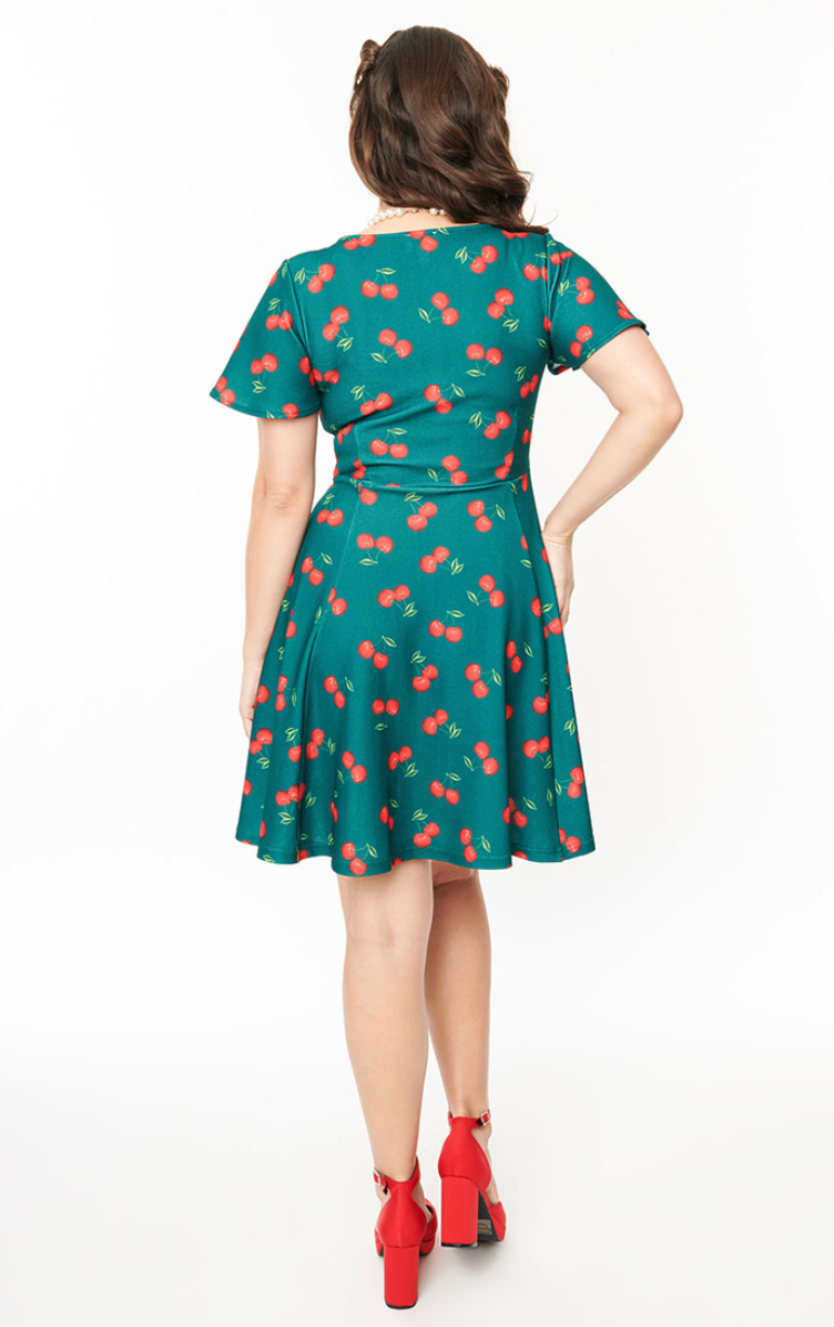 Introducing our Fit & Flare Cherry Dress, a flirty and fun 50s-style piece that will add a touch of playfulness to your wardrobe. With an all-over red cherry print, this green dress is perfect for any occasion. Embrace your feminine side and make a statement with this unique and stylish dress.