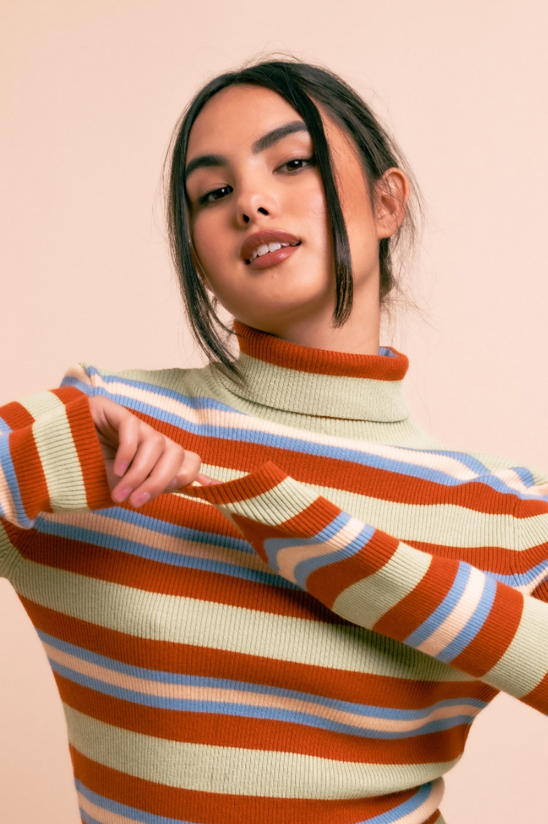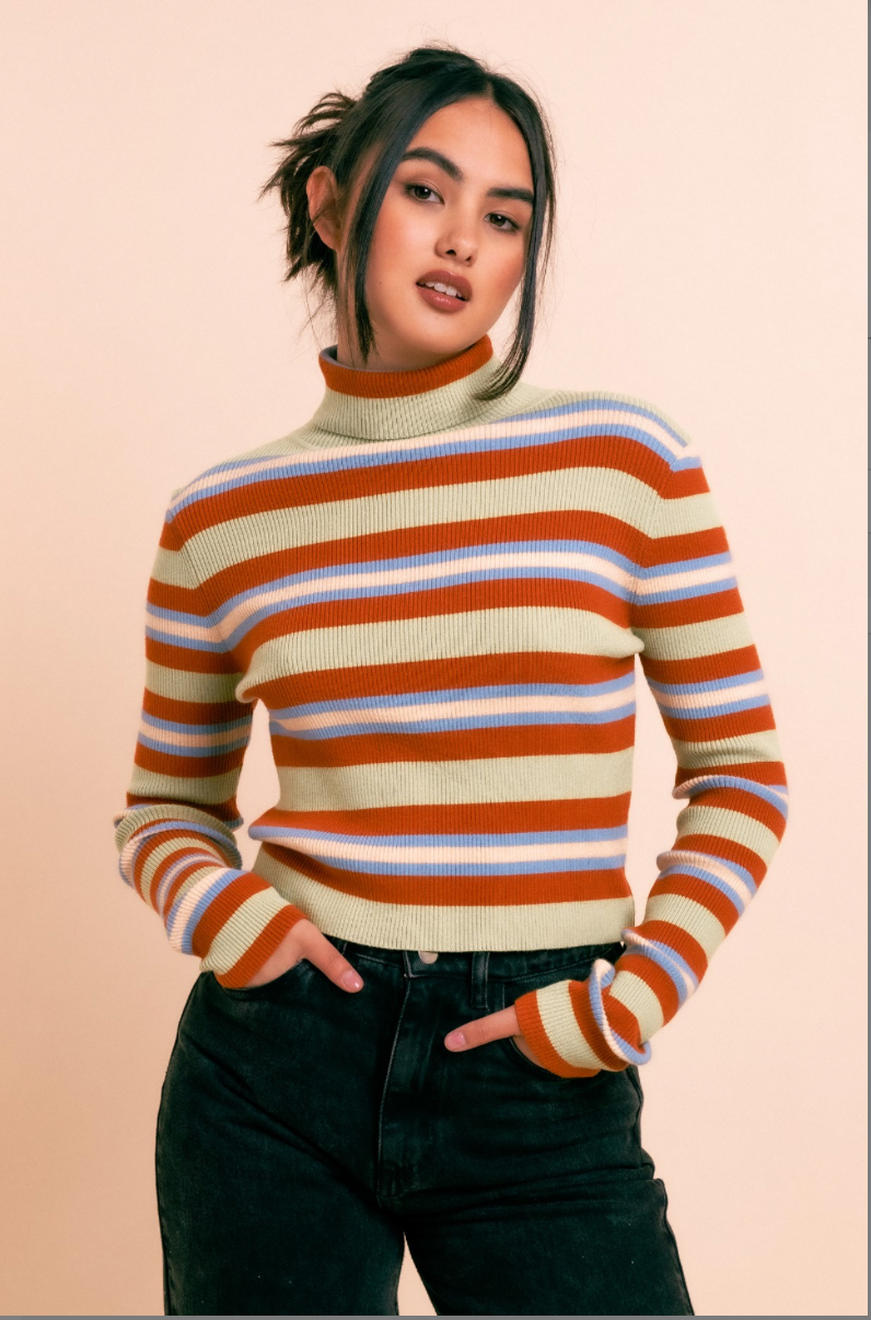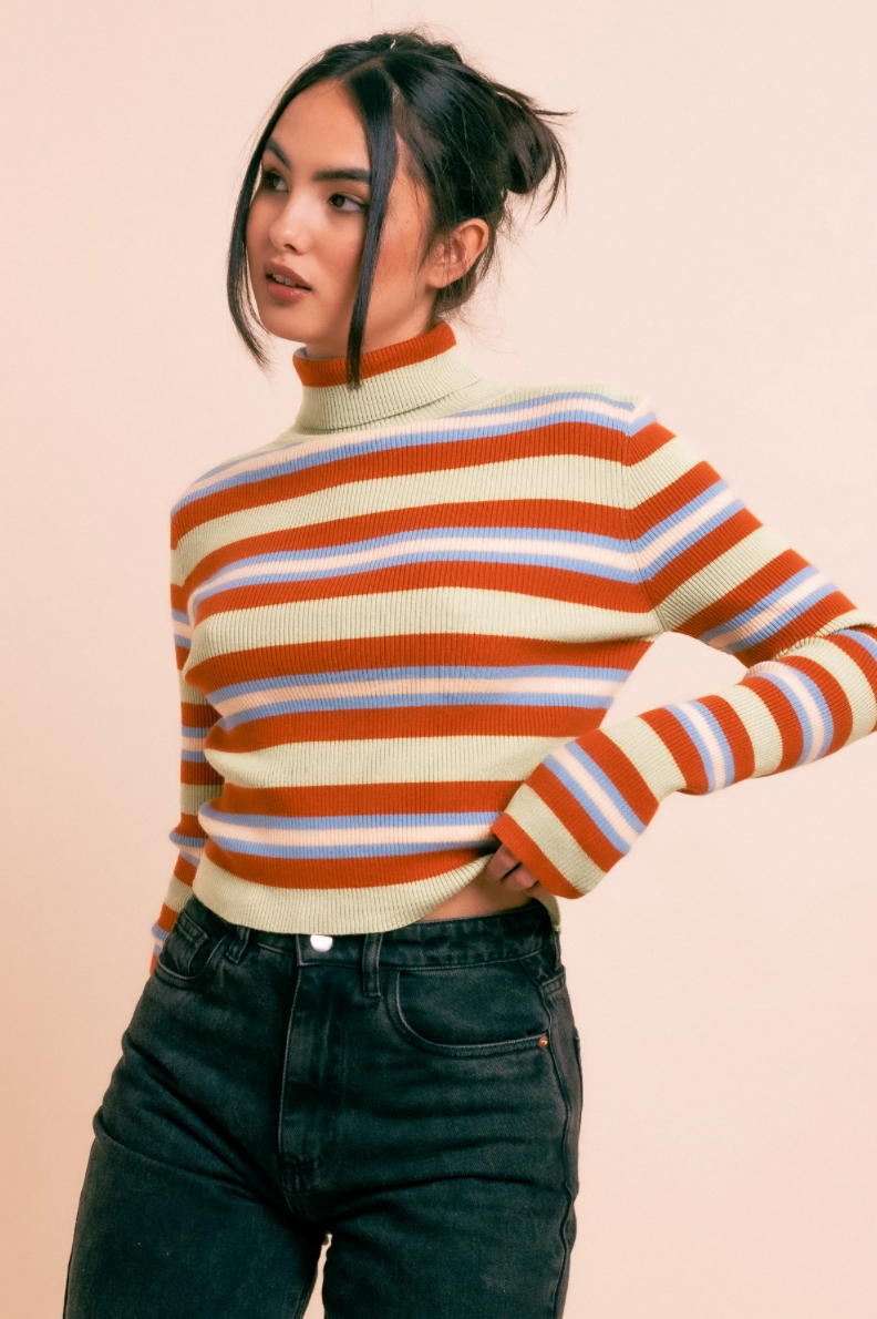 Be bold and stylish in this multi-stripe long-sleeve top with a turtle neck. You'll instantly feel chic and put together in this lightweight, breathable design. Dare to make a statement. Ready to go wherever life takes you!