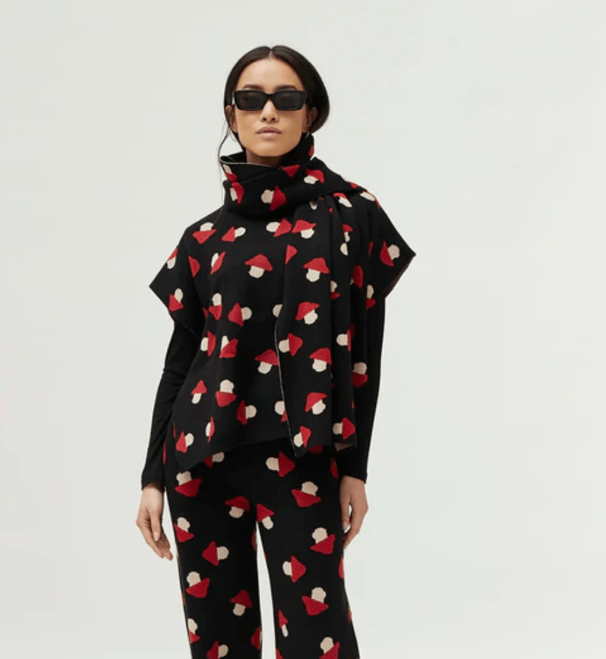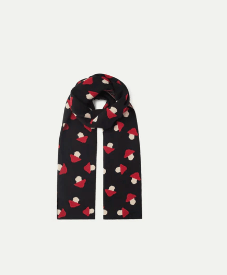 Looking for a unique and stylish addition to your wardrobe? Look no further than our Mushroom Print Scarf. This black scarf features a charming red and white mushroom design, adding a touch of whimsy to your outfit. Made from soft knit material, this scarf offers both fashion and comfort.