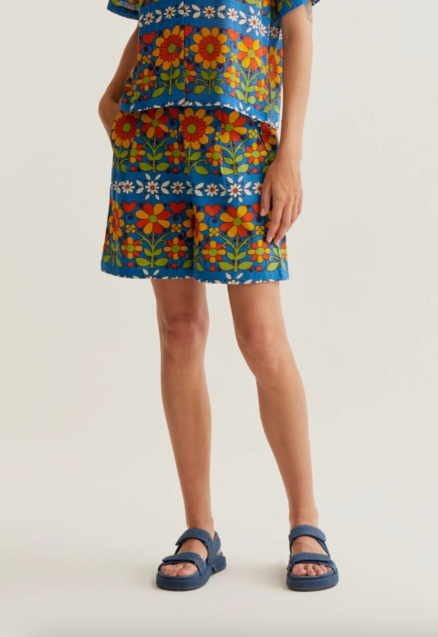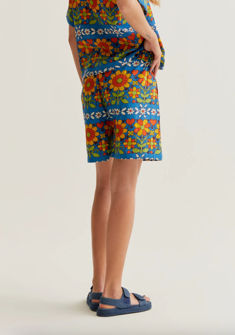 Garden High-Waisted Shorts in a serene blue hue, featuring a charming Scandinavian floral design that brings effortless style to your warm-weather wardrobe. The straight-leg silhouette offers a timeless, flattering fit, while functional side pockets keep your essentials within reach. Perfect for casual outings, garden strolls, relaxed weekend wear or pair with the Garden Camp Shirt .