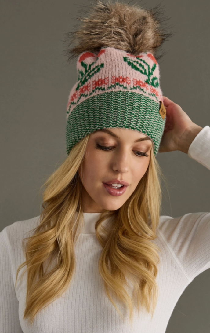 Stay cozy and stylish with this charming cherry-patterned knit hat, lined with soft fleece for extra warmth. The light pink background and retro cherry design add a playful, vintage touch, while the fluffy faux fur pom pom on top brings fun flair to your winter look. Perfect for chilly days, this hat combines comfort with a cute, classic appeal.