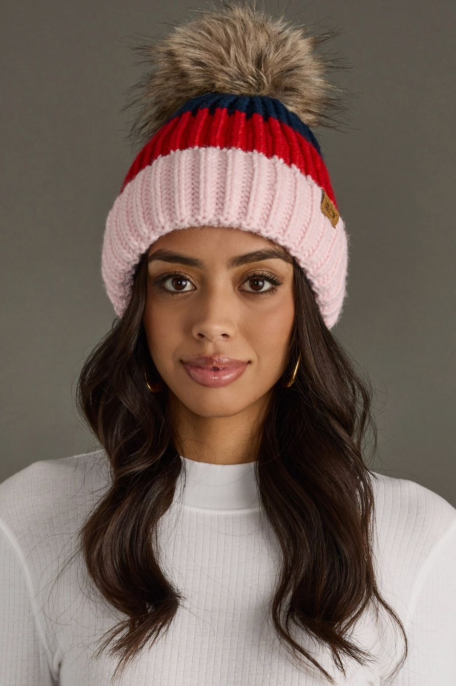 Bring back the fun of the '80s with this playful Colorblock Ribbed Fleece Lined Knit Pom Pom Hat. Featuring a light pink, red, and navy color blocking that makes a retro statement, this cozy knit hat keeps you warm with its soft fleece lining while the signature pom pom adds a whimsical touch. Perfect for anyone who loves nostalgic style with serious comfort. Make heads turn this season with a hat that's as bold as your personality.